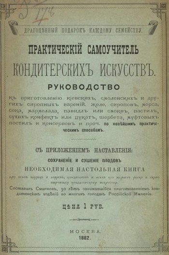 Описание: Руководство к приготовлению киевских, смоленских и других сиропных варений, желе, сиропов, морса, сока, мармелада, повидл или смокв, пастил, сухих конфет или цукат, щербета, муфтовых пастил и консервов и проч. по новейшим практическим способам.