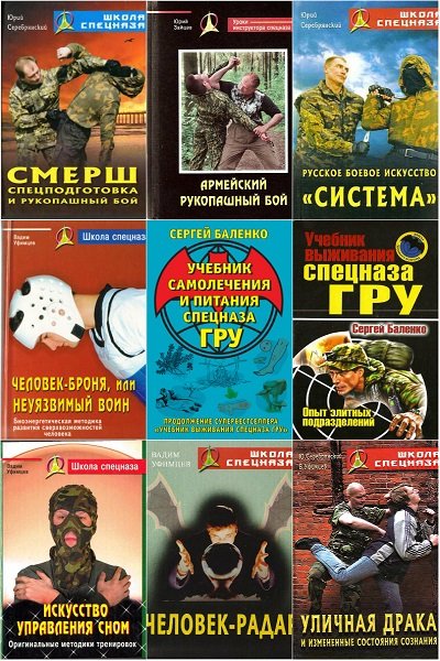 Школа спецназа - серия книг о боевых искусствах, системах подготовки специальных подразделений, о совершенствовании духа и тела. На страницах этих книг мастера русского боевого искусства раскрывают методы оздоровления, возвращения и сохранения молодости, предлагают универсальный метод сохранения жизненного ритма бесконечно долгое время.
