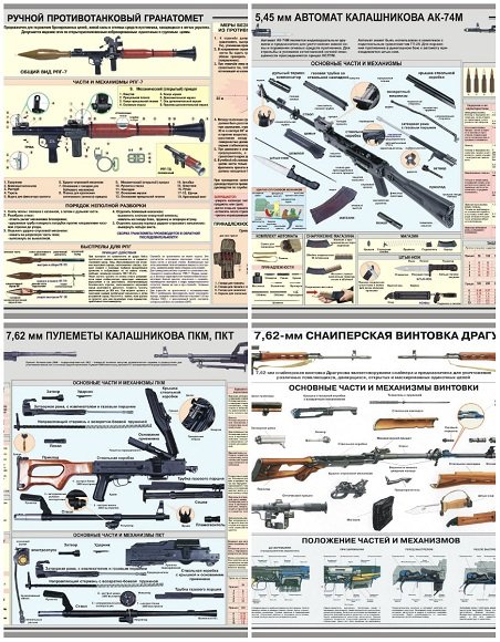 Подборка плакатов и схем различных образцов огнестрельного оружия и боеприпасов. Представлены автоматы, пистолеты, ручные гранаты, гранаты к подствольным гранатометам а также 2 плаката с вариациями на тюнинг АКМ и СВД.